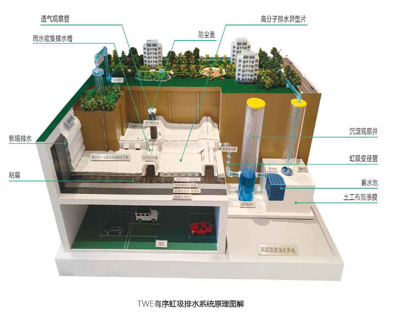 TWE有序虹吸排水系统原理:土壤中的水分通过渗透到达高分子防护排水异型片上方,水分经土工布过滤后流入高分子防护排(蓄)水异型片。水经高分子防护排(蓄)水异型片中的空隙不断流至相邻陷虹吸排水槽中。在虹吸排水槽上安装透气管,虹吸排水槽内的水在空隙、重力和气压作用下能很快汇集到相对应的出水口,出水口通过管道变径的方式使虹吸直管形成满流从而形成虹吸,在虹吸作用下,排水槽内的水不断被吸入沉淀观察井,流出顶板区域。流出的水分经观察井排入雨水收集系统内,待晴天需要对绿化植物进行浇灌时再对雨水进行循王环利用。