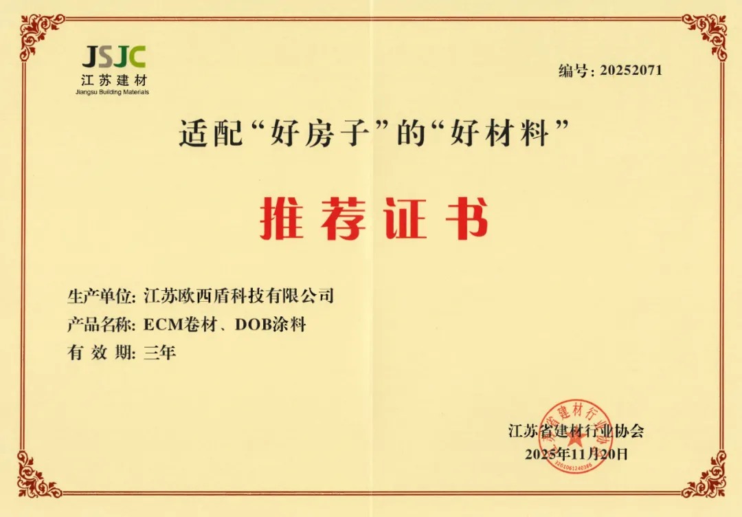 近日,经江苏省建材行业协会严格评审,欧西盾防水旗下ECM高分子防水卷材、DOB防水涂料两大核心产品,凭借卓越的产品性能及出色的环保品质,成功入选适配“好房子”的“好材料”名录,斩获权威推荐证书。这一荣誉不仅是对欧西盾防水产品价值的高度认可,更彰显了其在“守护好房子”道路上的坚实担当,为建筑防水行业树立了品质标杆。